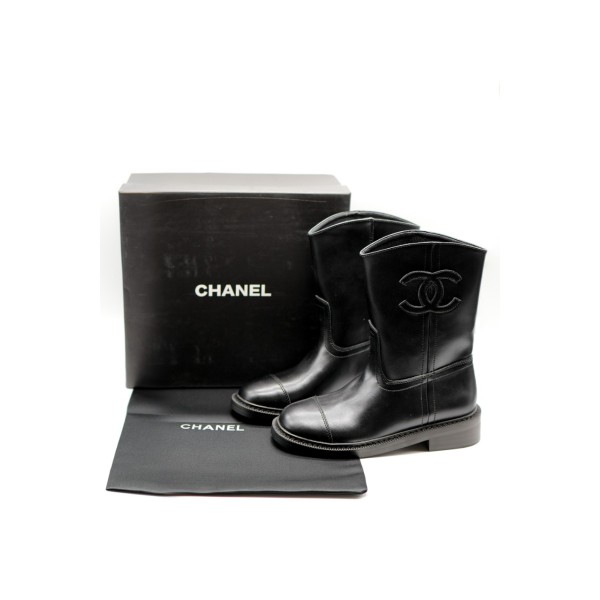 샤넬25FW 레더 앵클 미들 숏 부츠 CC로고 블랙 국내배송